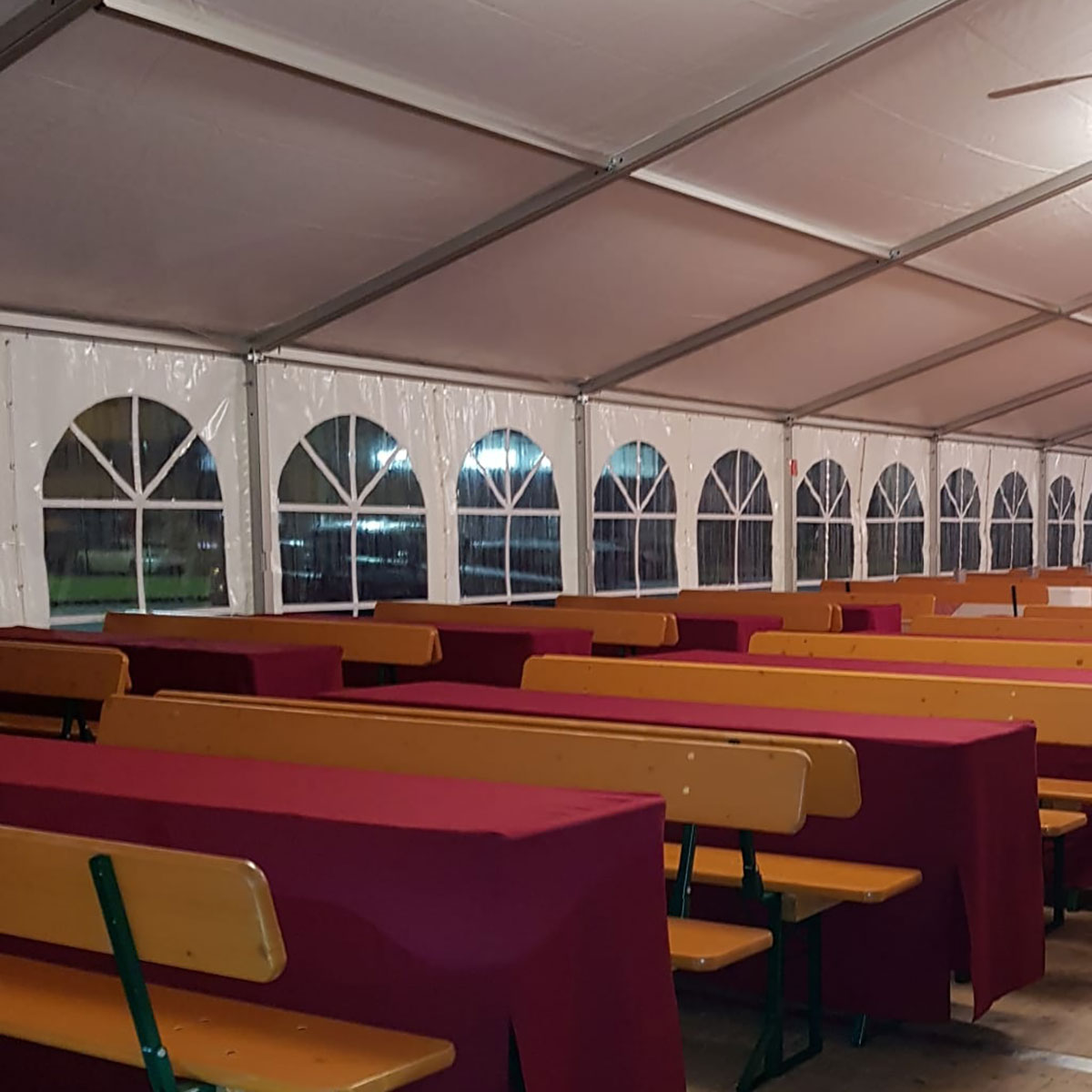 Mittels Ballastierungsgewichten kann das Zelt ab sofort komplett verankerungsfrei aufgestellt werden, so dass auch auf asphalitierter Fläche keine sichtbaren Spuren am Ende der Veranstaltung bleiben.
